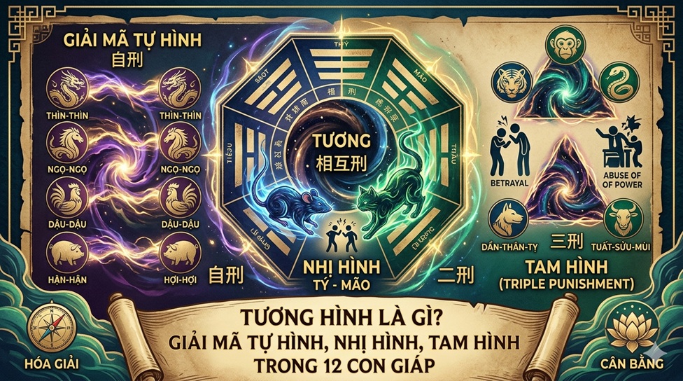 Trong hệ thống lý thuyết về tử vi và phong thủy phương Đông, bên cạnh những mối quan hệ cát tường như Tam hợp hay Lục hợp mang lại sự hanh thông, chúng ta không thể không nhắc đến những lực cản vô hình được gọi là Tương hình. Nếu như Tương xung là sự đối đầu trực diện, dễ nhận biết thì Tương hình lại giống như một loại áp lực ngầm, gây ra những rắc rối âm thầm nhưng dai dẳng trong cả sự nghiệp, tình duyên lẫn sức khỏe.